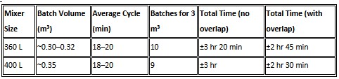 Nominal capacity is not the same as effective output. For instance, a 400 L cement mixer produces around 0.35 mÂł per batch. Say perhaps each cycle takes 20 minutes from loading to discharge, which equates to around mÂł per hour, but if you were to overlap your cycles, you can drastically raise your effective output: